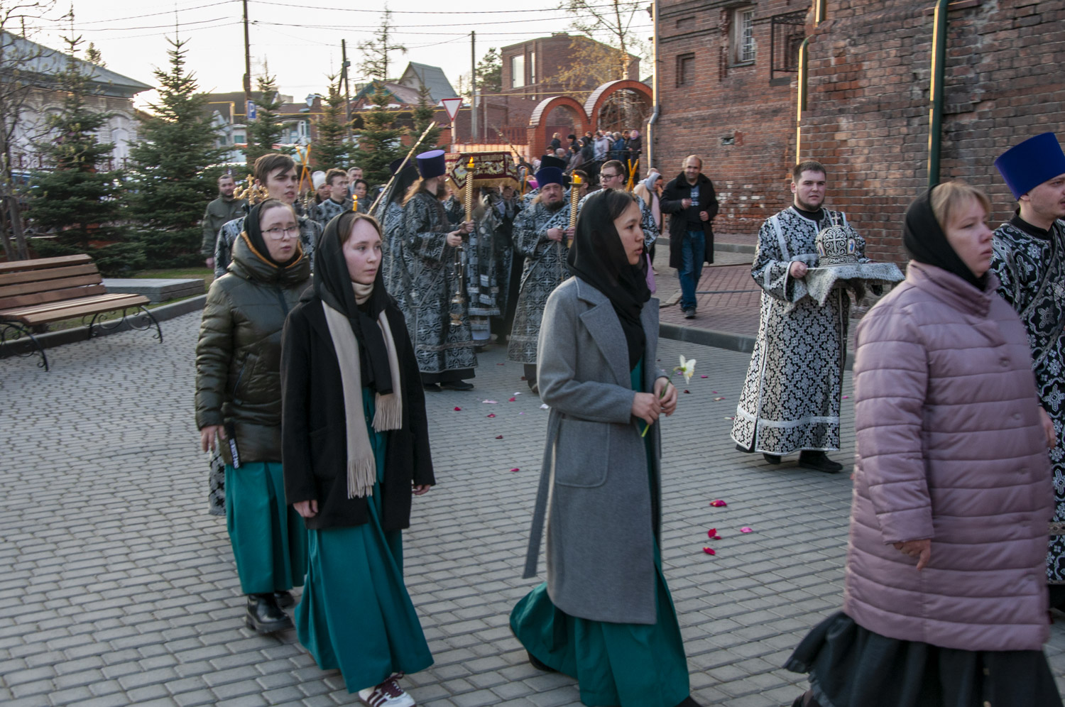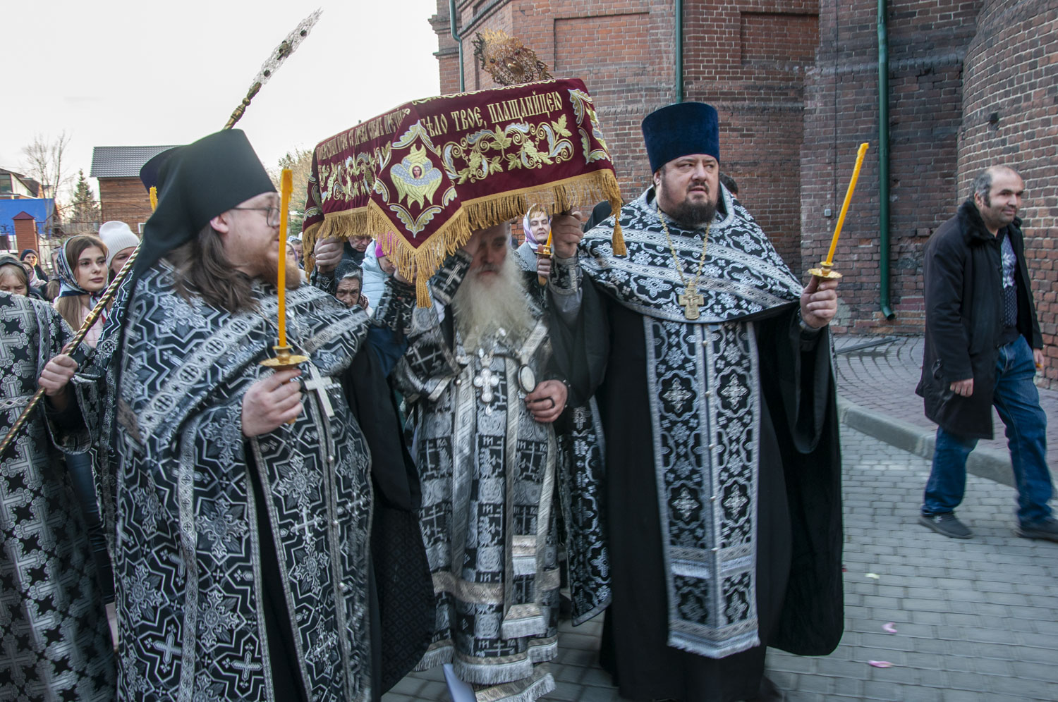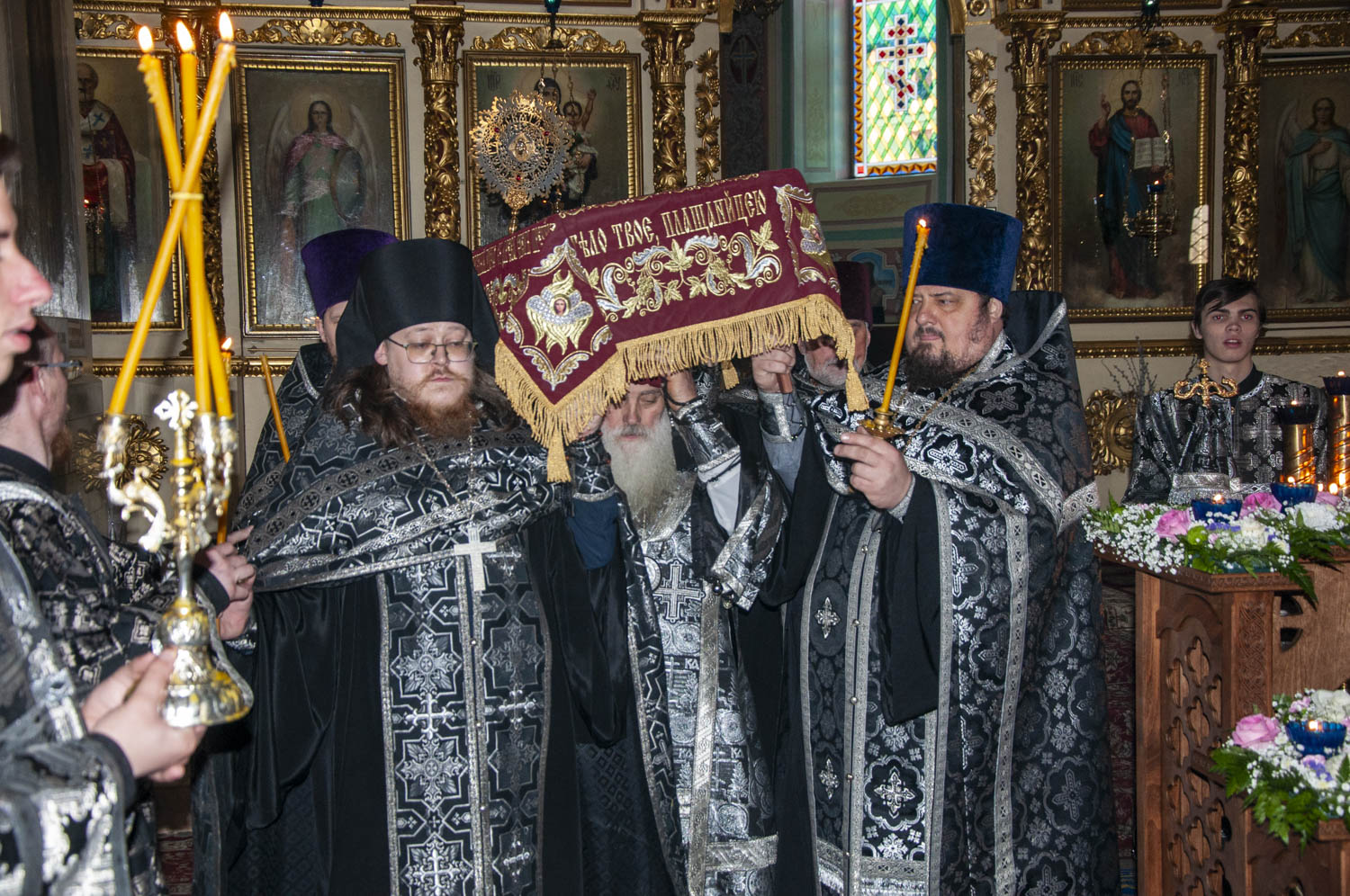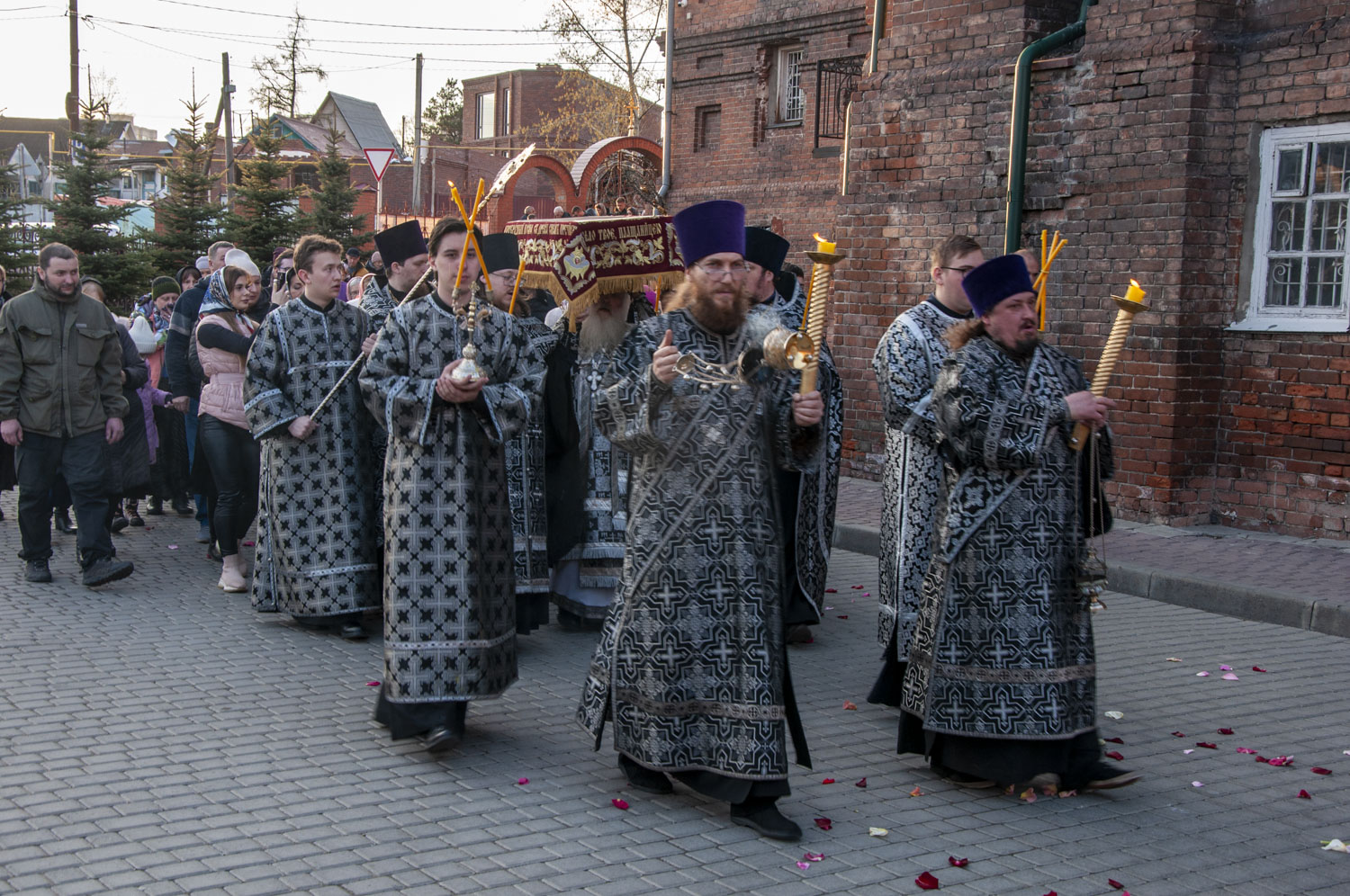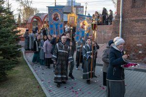 После возгласа «Слава Тебе, показавшему нам свет» было совершено троекратное каждение Плащаницы и по завершении великого славословия начался погребальный крестный ход. При пении Трисвятого погребальным напевом святая Плащаница была обнесена вокруг храма.