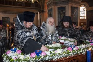 После прочтения шестопсалмия, мирной ектении и пения особых тропарей у святой Плащаницы Христа Спасителя, возлежащей на середине храма, митрополит Сергий и сослужащее духовенство совершили чтение похвал, которые чередовались пением стихов 118-го псалма (17-й кафизмы).